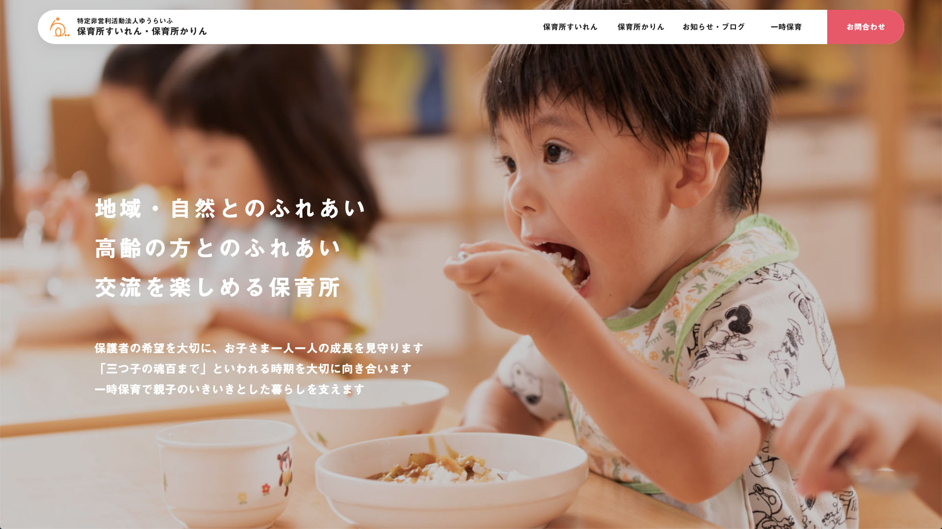 ホーム 制作実績 幼児保育施設の商品・サービスサイト 制作実績 たくさんの写真で 元気いっぱいを表現。 幼児保育施設の商品・サービスサイト 業種 教育、学習支援業 地域 滋賀県守山市 従業員数 10~19人 サービス WEBサイト保守管理 WordPress構築 写真撮影 商品・サービスサイト制作 URL https://www.youlife.ne.jp/hoikusho/ 介護福祉士施設に並列された0歳から2歳児までを預かる幼児保育所のウェブサイト。登園から降園まで丸一日子供たちの生き生きとした元気な姿を撮影。