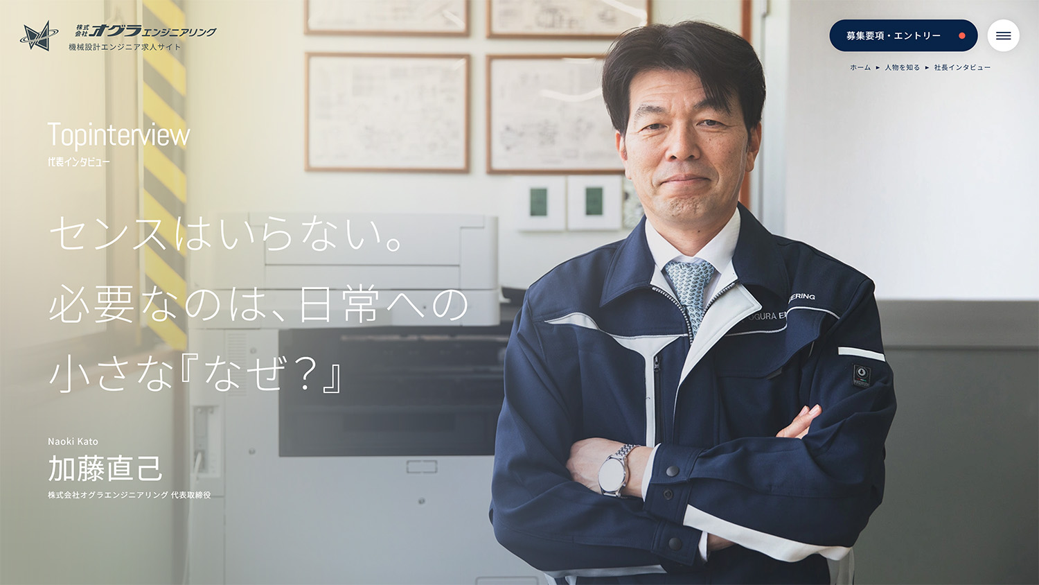 特に代表については、一般的なメッセージ形式ではなく、これまでの経歴や背景が伝わるインタビュー形式を採用し、人物像を通して会社の考え方が伝わる構成としています。