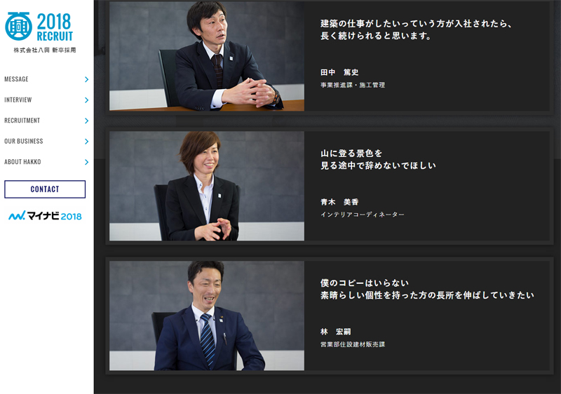 WEBで求人募集をやる場合、マイナビさんやリクナビさんのような求人サイトを利用するか、あるいは自社サイトで行うかという、大きな選択肢があると思います。個人的にはマイナビさんやリクナビさんの知名度・集客力は抜群で、優秀な新卒学生を大量に採用する場合は不可欠だろうと思いますが、決まったテンプレの中でしか自社をアピールできないですので、そういう意味では自社サイトで自社の個性を存分にアピールするのも有効な方法だろうと思っています。